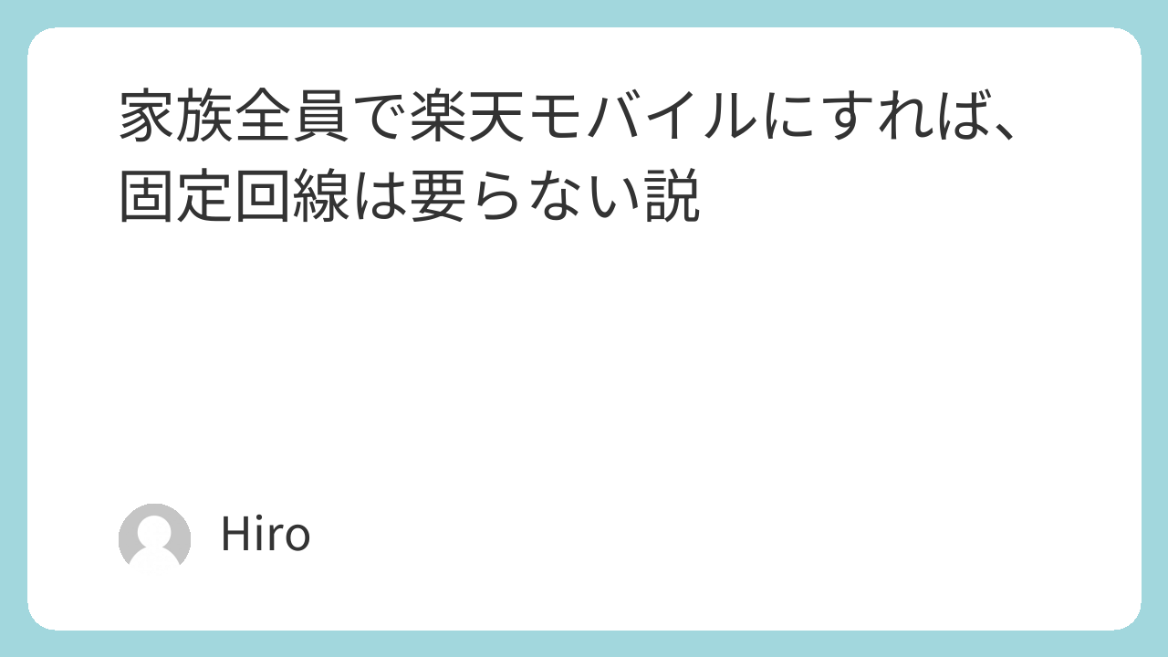 ふと、家族全員が楽天モバイルにして、必要に応じて各々がテザリングを活用すれば、固定回線はそもそも不要なのではないか、と思い至った。